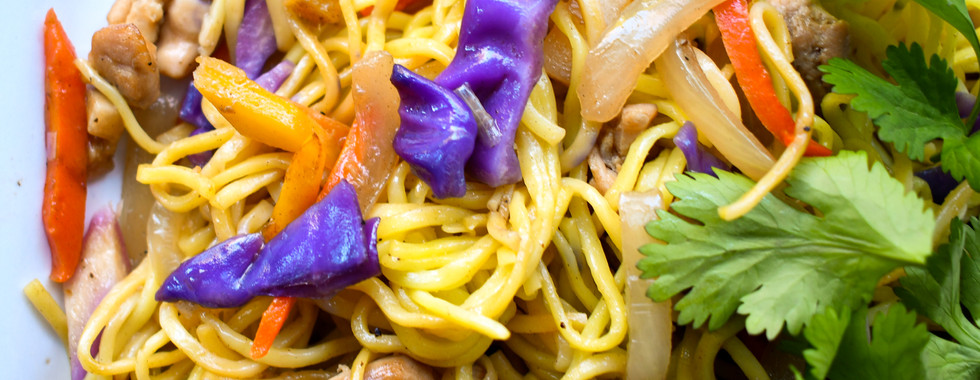2. In a large pan or wok, stir fry the garlic and onion until sizzling. Add chicken thighs or mushrooms and cook until ready. Add the three vegetables you’re using (cabbage, carrots, etc.). Add cooked noodles. Add your desired ratio of sesame oil, oyster sauce and soy sauce. Garnish with a bit of scallions or cilantro. Enjoy!